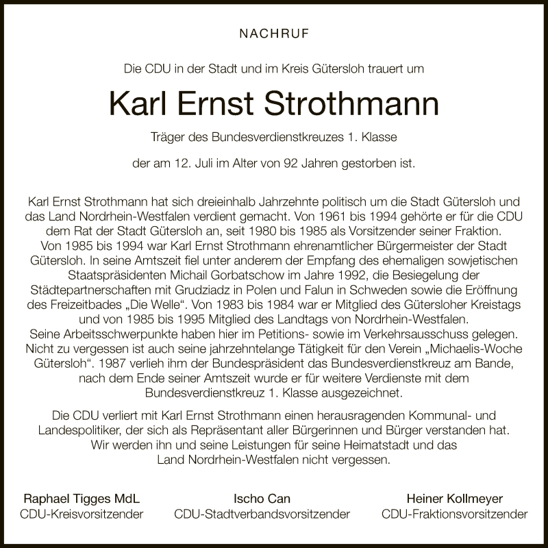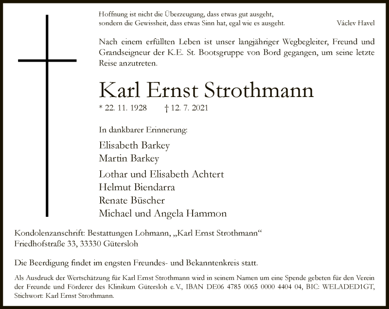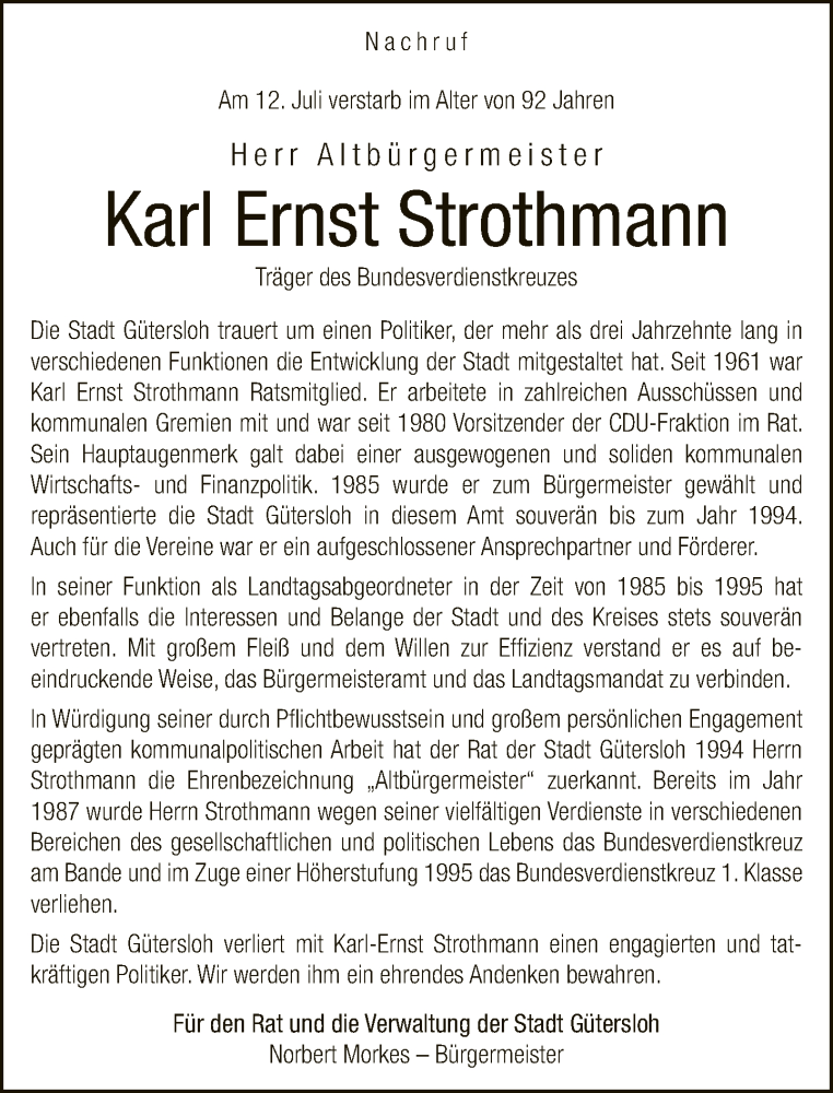 Hier finden Sie alle Traueranzeigen aus der Zeitung, die bisher für Karl Ernst Strothmann erschienen sind. Weitere Traueranzeigen, die in der Zeitung erscheinen, werden hier ebenfalls aufgelistet
