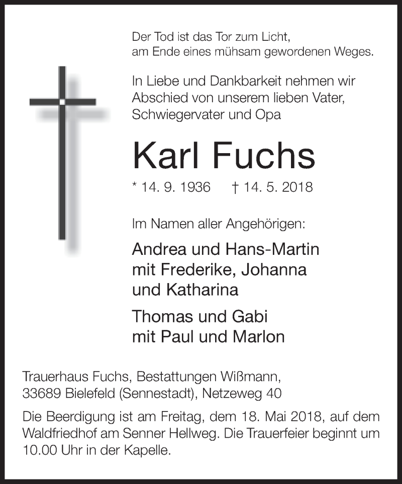 Hier finden Sie alle Traueranzeigen aus der Zeitung, die bisher für Karl Fuchs erschienen sind. Weitere Traueranzeigen, die in der Zeitung erscheinen, werden hier ebenfalls aufgelistet