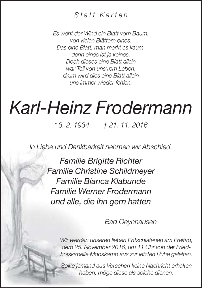 Hier finden Sie alle Traueranzeigen aus der Zeitung, die bisher für Karl-Heinz Frodermann erschienen sind. Weitere Traueranzeigen, die in der Zeitung erscheinen, werden hier ebenfalls aufgelistet