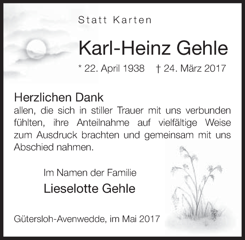 Hier finden Sie alle Traueranzeigen aus der Zeitung, die bisher für Karl-Heinz Gehle erschienen sind. Weitere Traueranzeigen, die in der Zeitung erscheinen, werden hier ebenfalls aufgelistet