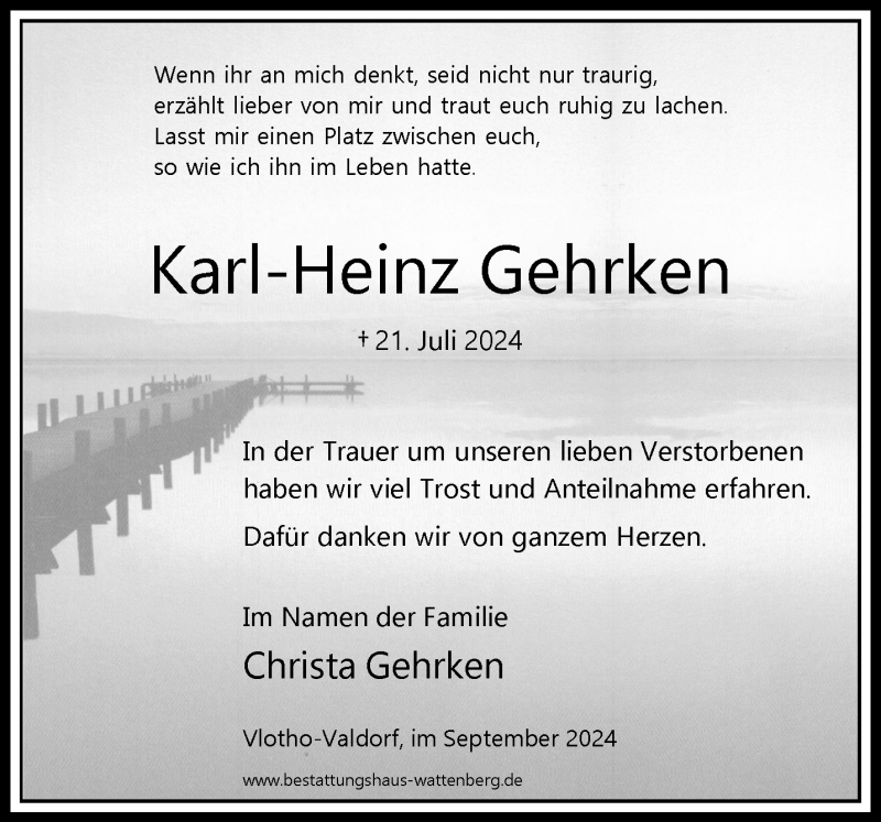 Hier finden Sie alle Traueranzeigen aus der Zeitung, die bisher für Karl-Heinz Gehrken erschienen sind. Weitere Traueranzeigen, die in der Zeitung erscheinen, werden hier ebenfalls aufgelistet