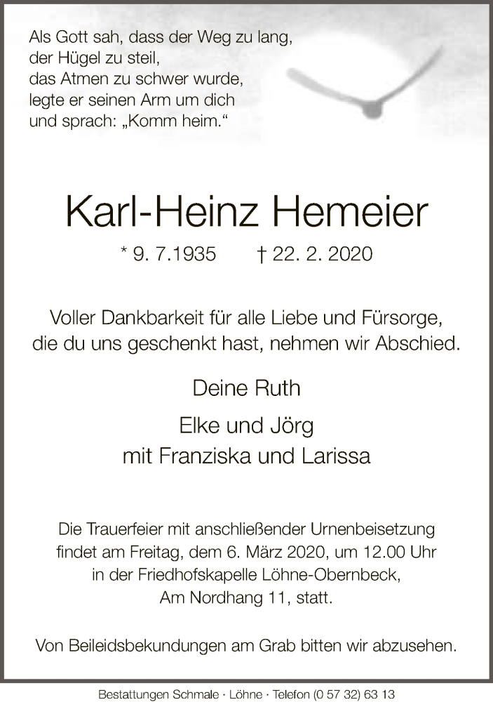 Hier finden Sie alle Traueranzeigen aus der Zeitung, die bisher für Karl-Heinz Hemeier erschienen sind. Weitere Traueranzeigen, die in der Zeitung erscheinen, werden hier ebenfalls aufgelistet