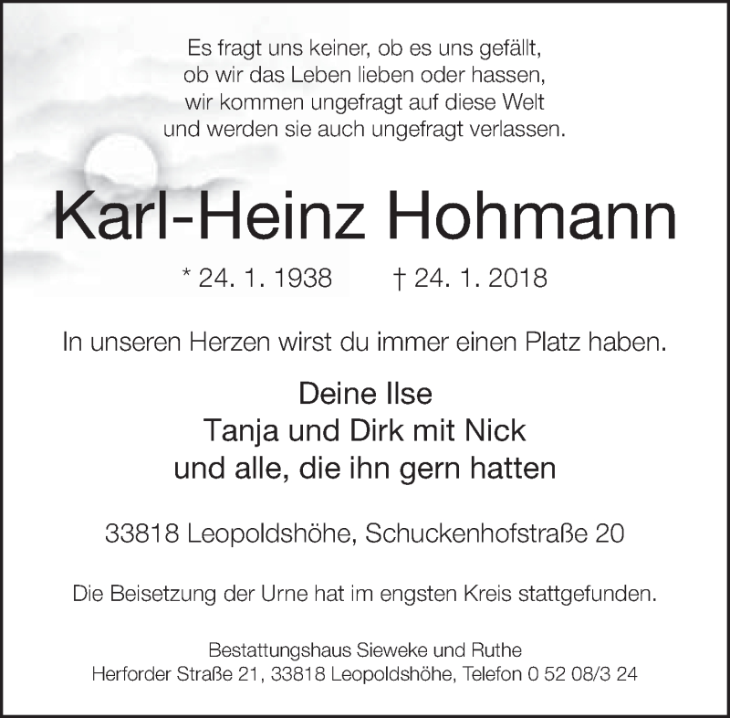Hier finden Sie alle Traueranzeigen aus der Zeitung, die bisher für Karl-Heinz Hohmann erschienen sind. Weitere Traueranzeigen, die in der Zeitung erscheinen, werden hier ebenfalls aufgelistet