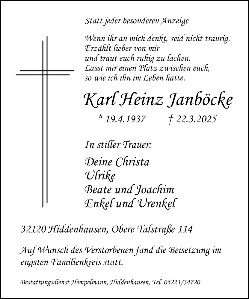 Hier finden Sie alle Traueranzeigen aus der Zeitung, die bisher für Karl Heinz Janböcke erschienen sind. Weitere Traueranzeigen, die in der Zeitung erscheinen, werden hier ebenfalls aufgelistet