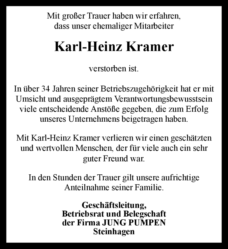 Hier finden Sie alle Traueranzeigen aus der Zeitung, die bisher für Karl-Heinz Kramer erschienen sind. Weitere Traueranzeigen, die in der Zeitung erscheinen, werden hier ebenfalls aufgelistet