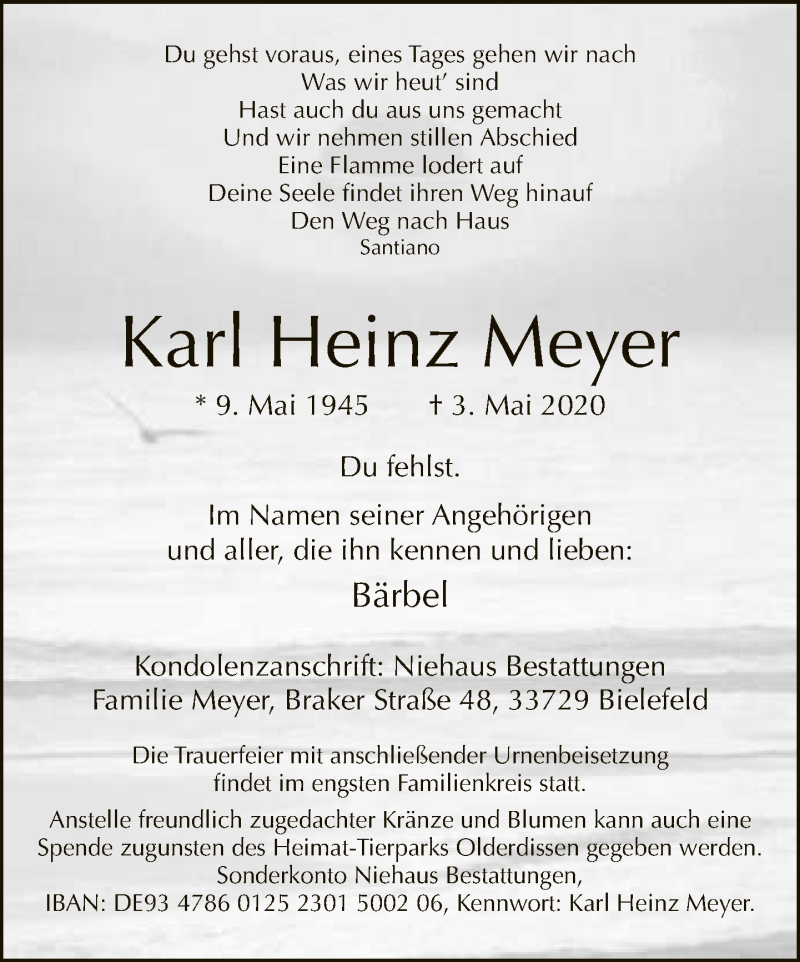 Hier finden Sie alle Traueranzeigen aus der Zeitung, die bisher für Karl Heinz Meyer erschienen sind. Weitere Traueranzeigen, die in der Zeitung erscheinen, werden hier ebenfalls aufgelistet