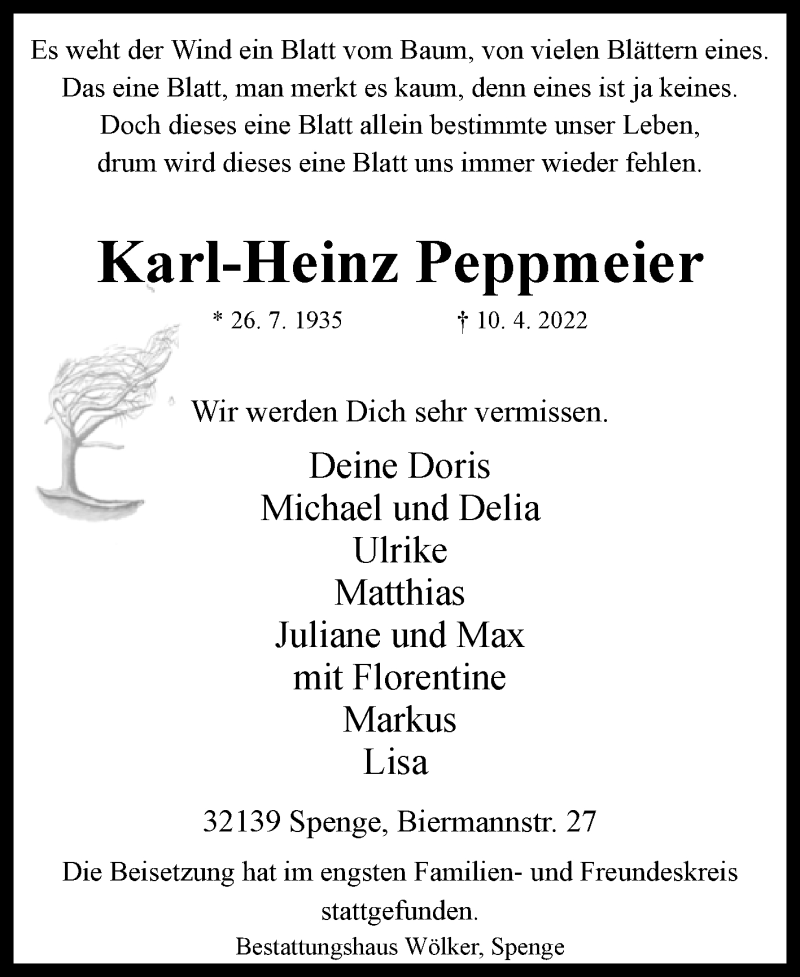 Hier finden Sie alle Traueranzeigen aus der Zeitung, die bisher für Karl-Heinz Peppmeier erschienen sind. Weitere Traueranzeigen, die in der Zeitung erscheinen, werden hier ebenfalls aufgelistet