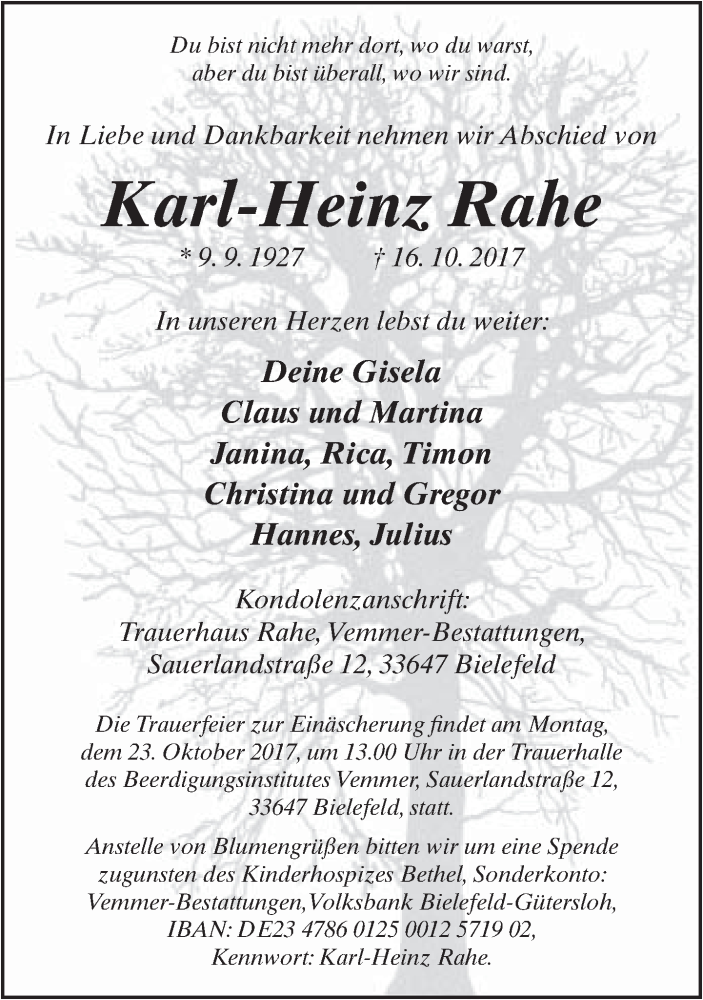 Hier finden Sie alle Traueranzeigen aus der Zeitung, die bisher für Karl-Heinz Rahe erschienen sind. Weitere Traueranzeigen, die in der Zeitung erscheinen, werden hier ebenfalls aufgelistet