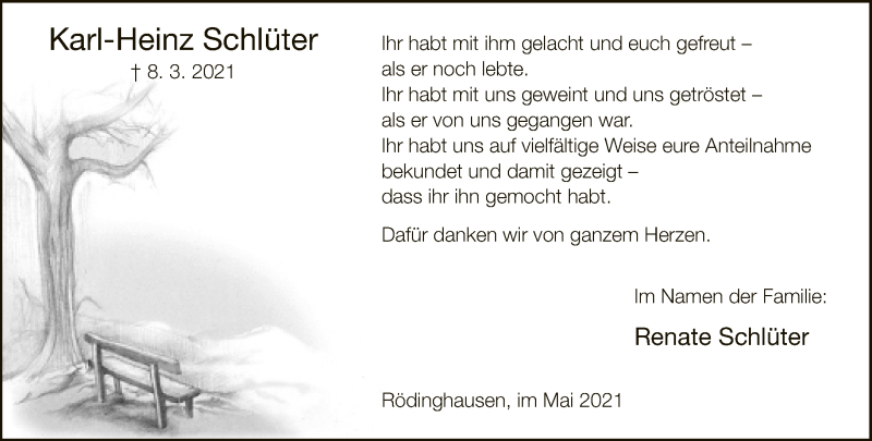 Hier finden Sie alle Traueranzeigen aus der Zeitung, die bisher für Karl-Heinz Schlüter erschienen sind. Weitere Traueranzeigen, die in der Zeitung erscheinen, werden hier ebenfalls aufgelistet