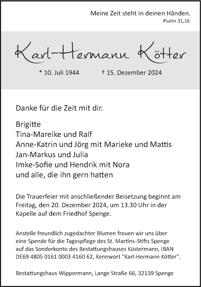 Hier finden Sie alle Traueranzeigen aus der Zeitung, die bisher für Karl-Hermann Kötter erschienen sind. Weitere Traueranzeigen, die in der Zeitung erscheinen, werden hier ebenfalls aufgelistet