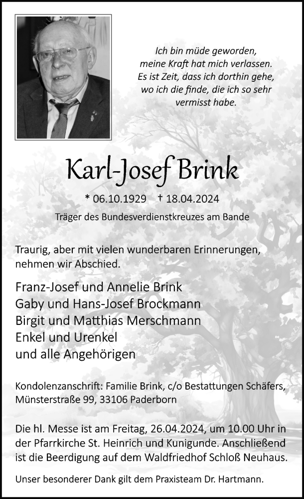 Hier finden Sie alle Traueranzeigen aus der Zeitung, die bisher für Karl-Josef Brink erschienen sind. Weitere Traueranzeigen, die in der Zeitung erscheinen, werden hier ebenfalls aufgelistet