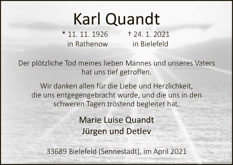 Hier finden Sie alle Traueranzeigen aus der Zeitung, die bisher für Karl Quandt erschienen sind. Weitere Traueranzeigen, die in der Zeitung erscheinen, werden hier ebenfalls aufgelistet