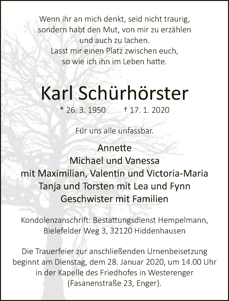 Hier finden Sie alle Traueranzeigen aus der Zeitung, die bisher für Karl Schürhörster erschienen sind. Weitere Traueranzeigen, die in der Zeitung erscheinen, werden hier ebenfalls aufgelistet