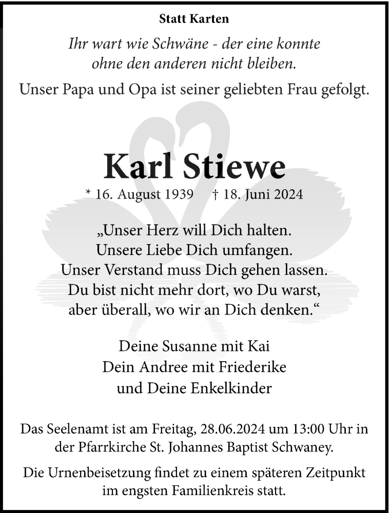 Hier finden Sie alle Traueranzeigen aus der Zeitung, die bisher für Karl Stiewe erschienen sind. Weitere Traueranzeigen, die in der Zeitung erscheinen, werden hier ebenfalls aufgelistet