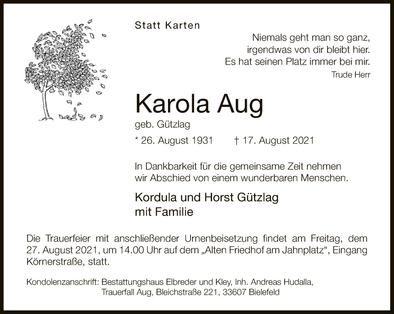 Hier finden Sie alle Traueranzeigen aus der Zeitung, die bisher für Karola Aug erschienen sind. Weitere Traueranzeigen, die in der Zeitung erscheinen, werden hier ebenfalls aufgelistet