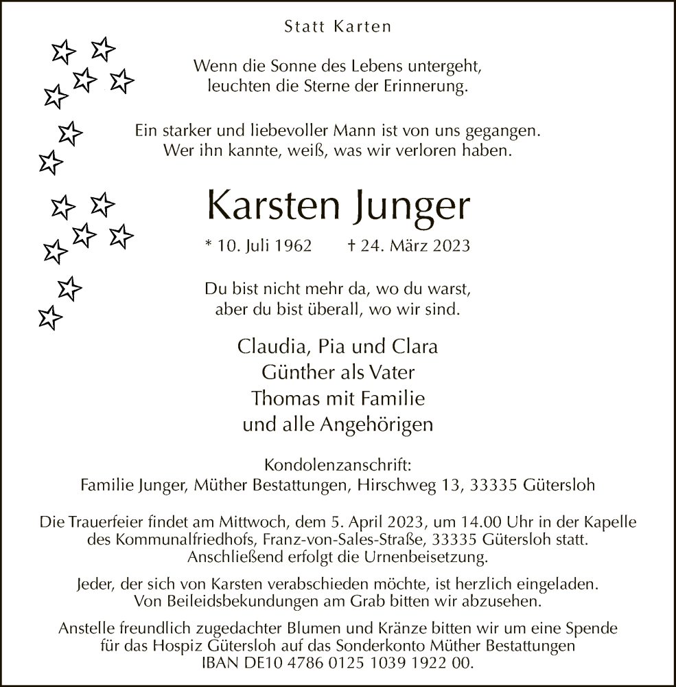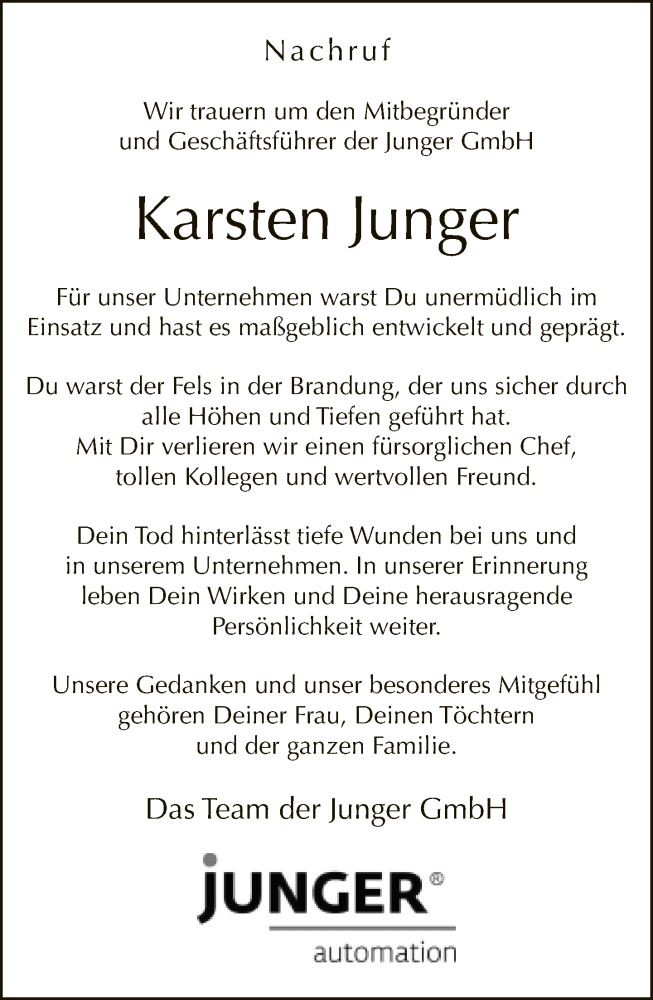 Hier finden Sie alle Traueranzeigen aus der Zeitung, die bisher für Karsten Junger erschienen sind. Weitere Traueranzeigen, die in der Zeitung erscheinen, werden hier ebenfalls aufgelistet