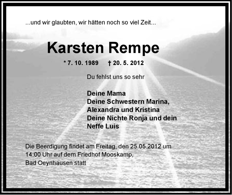 Hier finden Sie alle Traueranzeigen aus der Zeitung, die bisher für Karsten Rempe erschienen sind. Weitere Traueranzeigen, die in der Zeitung erscheinen, werden hier ebenfalls aufgelistet