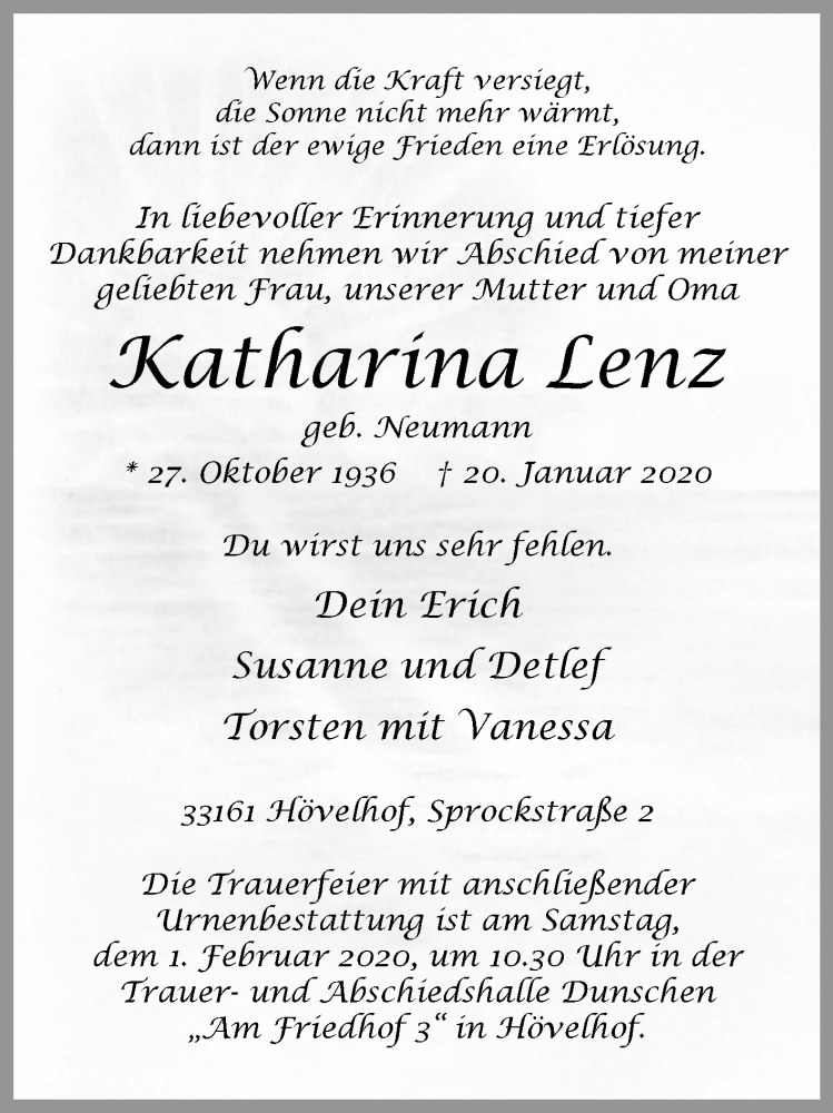 Hier finden Sie alle Traueranzeigen aus der Zeitung, die bisher für Katharina Lenz erschienen sind. Weitere Traueranzeigen, die in der Zeitung erscheinen, werden hier ebenfalls aufgelistet