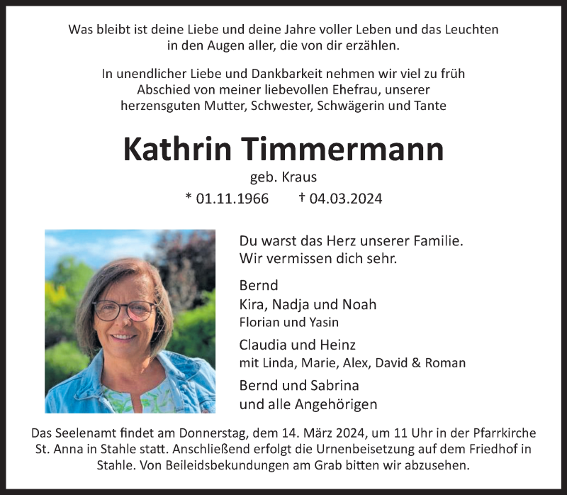 Hier finden Sie alle Traueranzeigen aus der Zeitung, die bisher für Kathrin Timmermann erschienen sind. Weitere Traueranzeigen, die in der Zeitung erscheinen, werden hier ebenfalls aufgelistet
