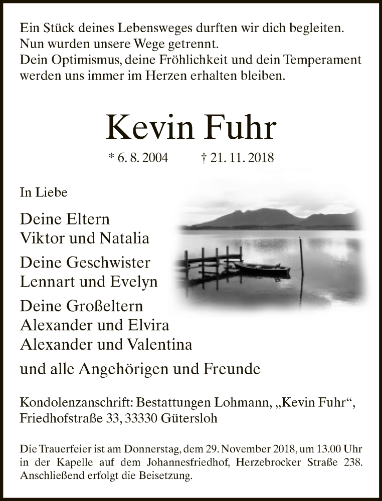 Hier finden Sie alle Traueranzeigen aus der Zeitung, die bisher für Kevin Fuhr erschienen sind. Weitere Traueranzeigen, die in der Zeitung erscheinen, werden hier ebenfalls aufgelistet