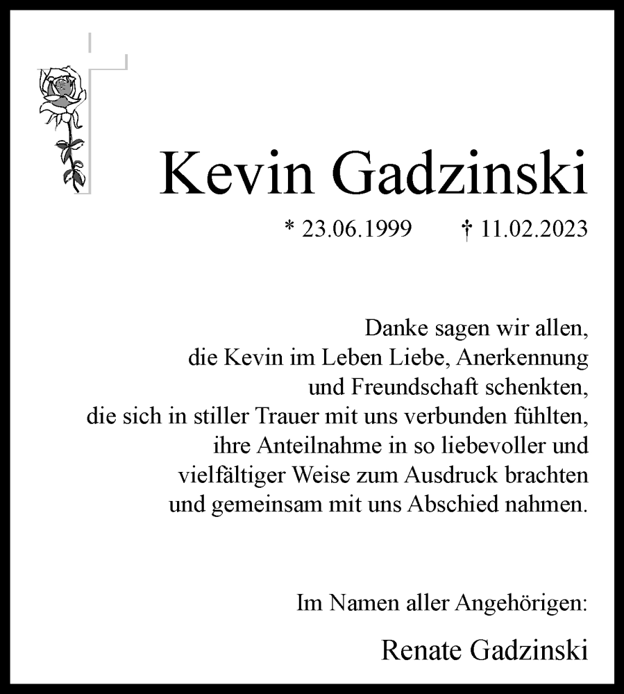 Hier finden Sie alle Traueranzeigen aus der Zeitung, die bisher für Kevin Gadzinski erschienen sind. Weitere Traueranzeigen, die in der Zeitung erscheinen, werden hier ebenfalls aufgelistet