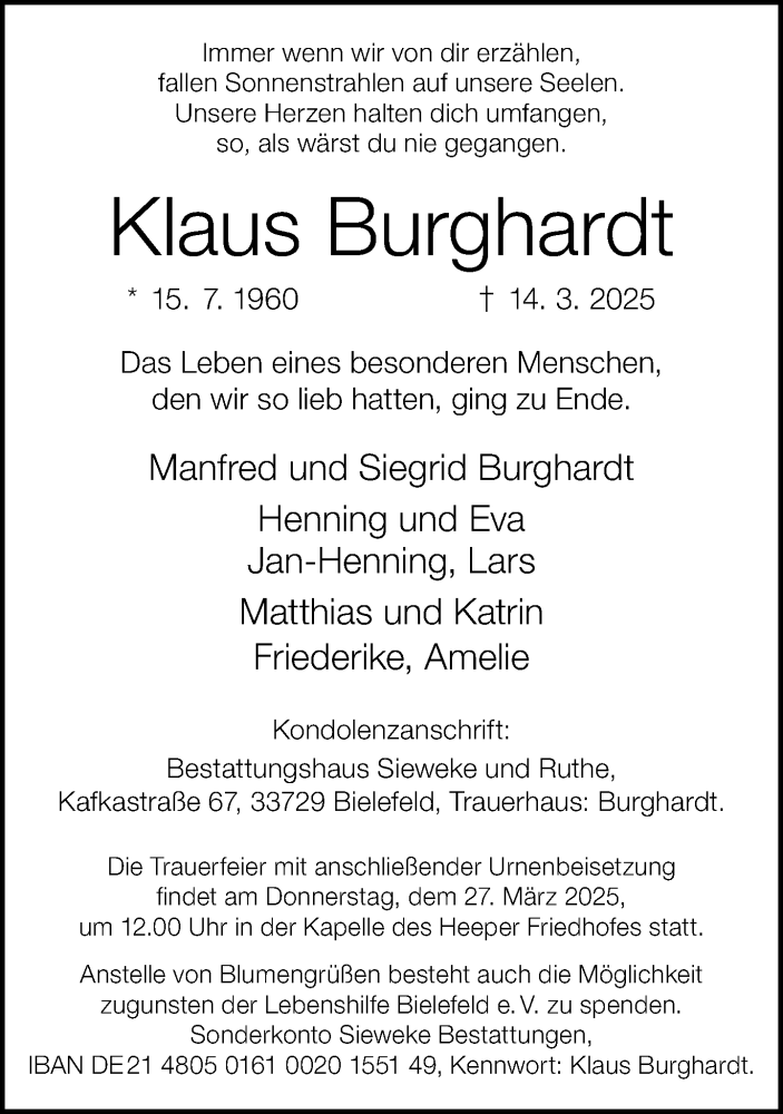 Hier finden Sie alle Traueranzeigen aus der Zeitung, die bisher für Klaus Burghardt erschienen sind. Weitere Traueranzeigen, die in der Zeitung erscheinen, werden hier ebenfalls aufgelistet