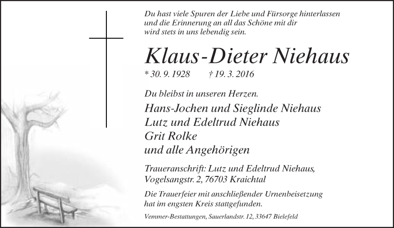 Hier finden Sie alle Traueranzeigen aus der Zeitung, die bisher für Klaus-Dieter Niehaus erschienen sind. Weitere Traueranzeigen, die in der Zeitung erscheinen, werden hier ebenfalls aufgelistet