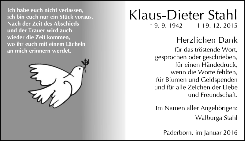 Hier finden Sie alle Traueranzeigen aus der Zeitung, die bisher für Klaus-Dieter Stahl erschienen sind. Weitere Traueranzeigen, die in der Zeitung erscheinen, werden hier ebenfalls aufgelistet