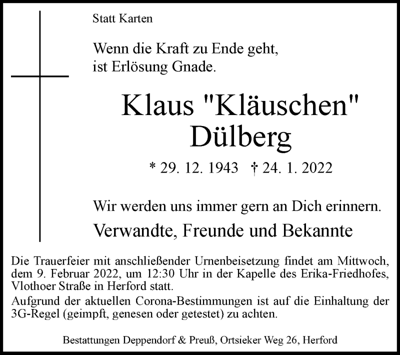Hier finden Sie alle Traueranzeigen aus der Zeitung, die bisher für Klaus Dülberg erschienen sind. Weitere Traueranzeigen, die in der Zeitung erscheinen, werden hier ebenfalls aufgelistet
