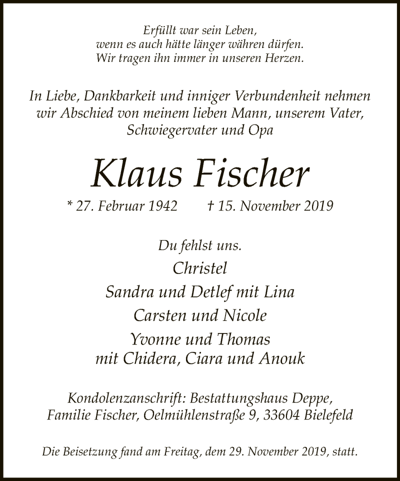 Hier finden Sie alle Traueranzeigen aus der Zeitung, die bisher für Klaus Fischer erschienen sind. Weitere Traueranzeigen, die in der Zeitung erscheinen, werden hier ebenfalls aufgelistet
