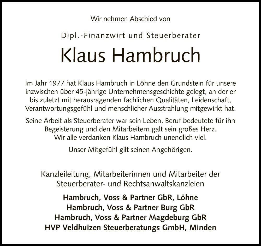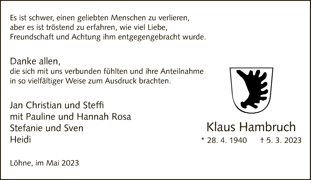 Hier finden Sie alle Traueranzeigen aus der Zeitung, die bisher für Klaus Hambruch erschienen sind. Weitere Traueranzeigen, die in der Zeitung erscheinen, werden hier ebenfalls aufgelistet