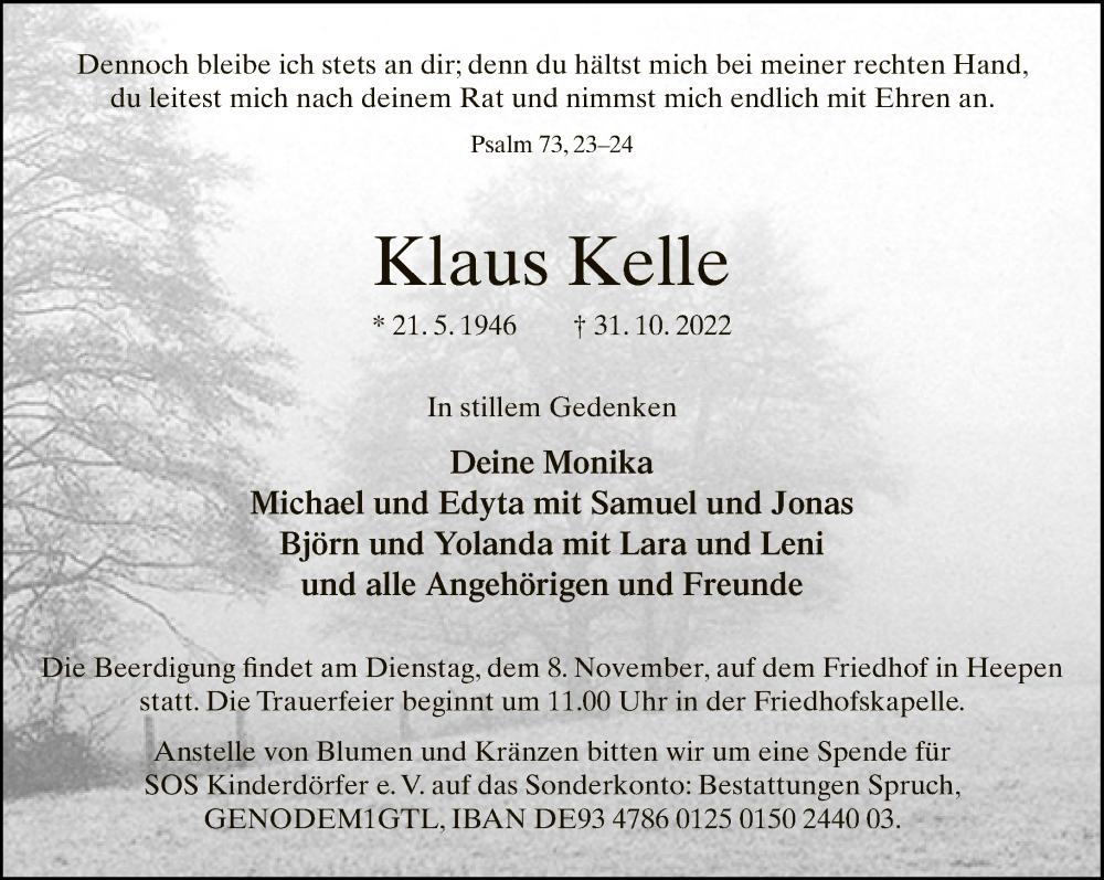 Hier finden Sie alle Traueranzeigen aus der Zeitung, die bisher für Klaus Kelle erschienen sind. Weitere Traueranzeigen, die in der Zeitung erscheinen, werden hier ebenfalls aufgelistet