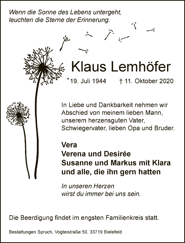 Hier finden Sie alle Traueranzeigen aus der Zeitung, die bisher für Klaus Lemhöfer erschienen sind. Weitere Traueranzeigen, die in der Zeitung erscheinen, werden hier ebenfalls aufgelistet