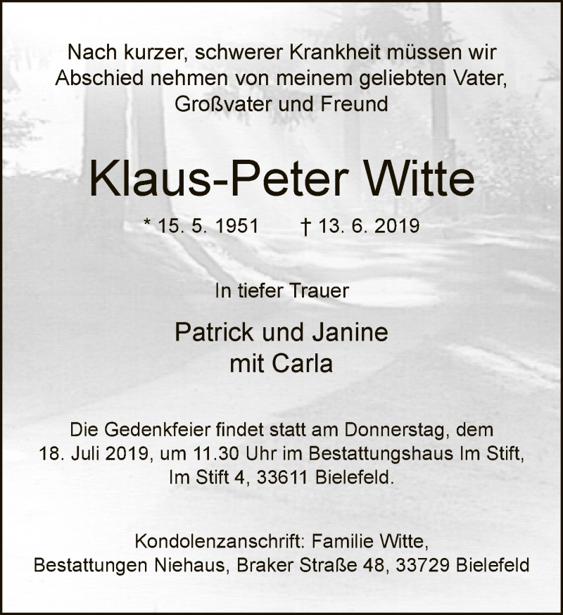 Hier finden Sie alle Traueranzeigen aus der Zeitung, die bisher für Klaus-Peter Witte erschienen sind. Weitere Traueranzeigen, die in der Zeitung erscheinen, werden hier ebenfalls aufgelistet
