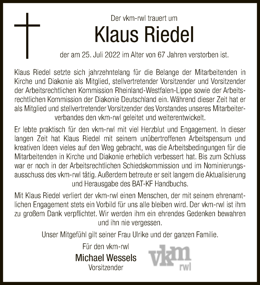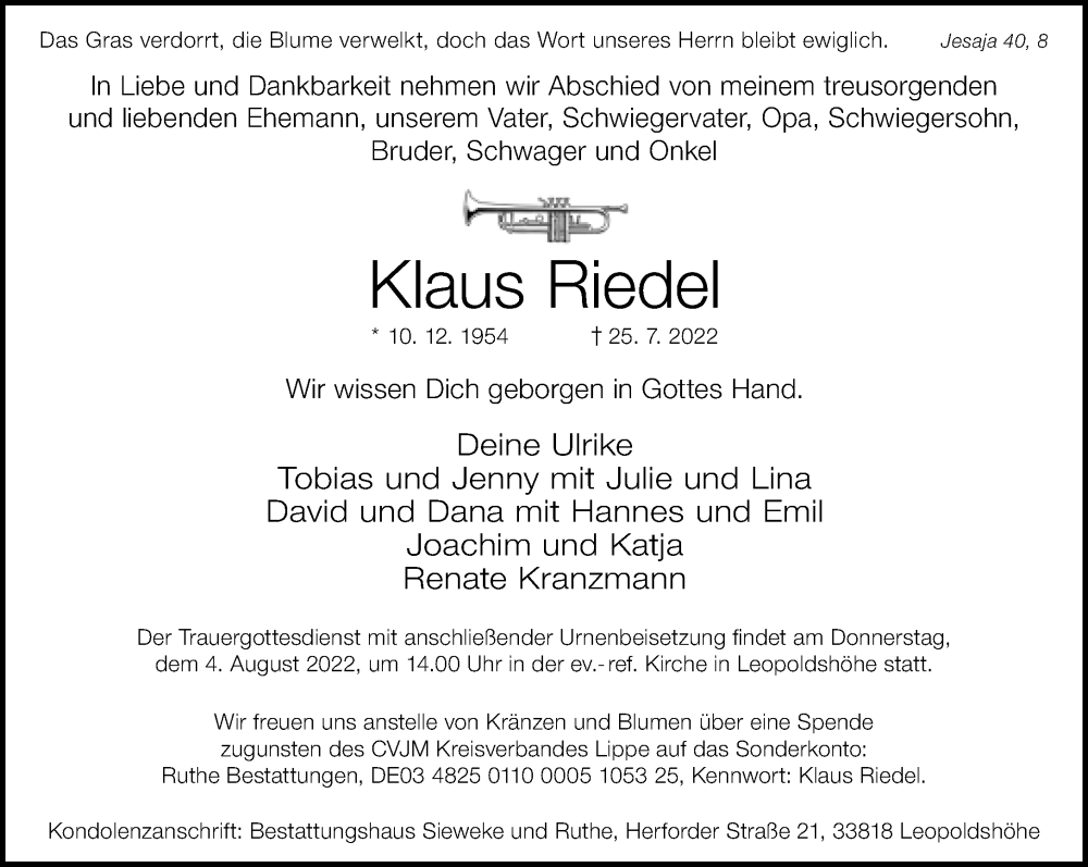 Hier finden Sie alle Traueranzeigen aus der Zeitung, die bisher für Klaus Riedel erschienen sind. Weitere Traueranzeigen, die in der Zeitung erscheinen, werden hier ebenfalls aufgelistet