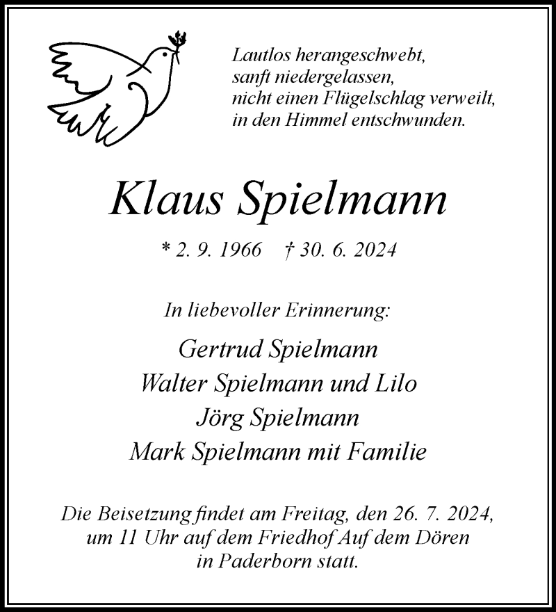 Hier finden Sie alle Traueranzeigen aus der Zeitung, die bisher für Klaus Spielmann erschienen sind. Weitere Traueranzeigen, die in der Zeitung erscheinen, werden hier ebenfalls aufgelistet