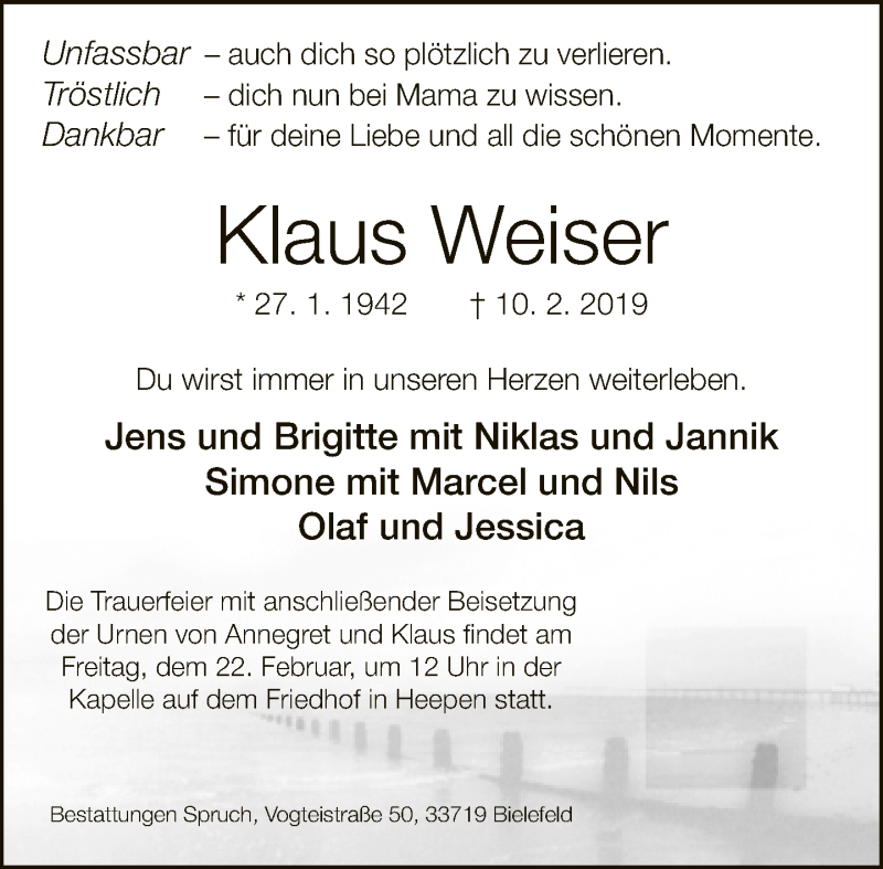 Hier finden Sie alle Traueranzeigen aus der Zeitung, die bisher für Klaus Weiser erschienen sind. Weitere Traueranzeigen, die in der Zeitung erscheinen, werden hier ebenfalls aufgelistet