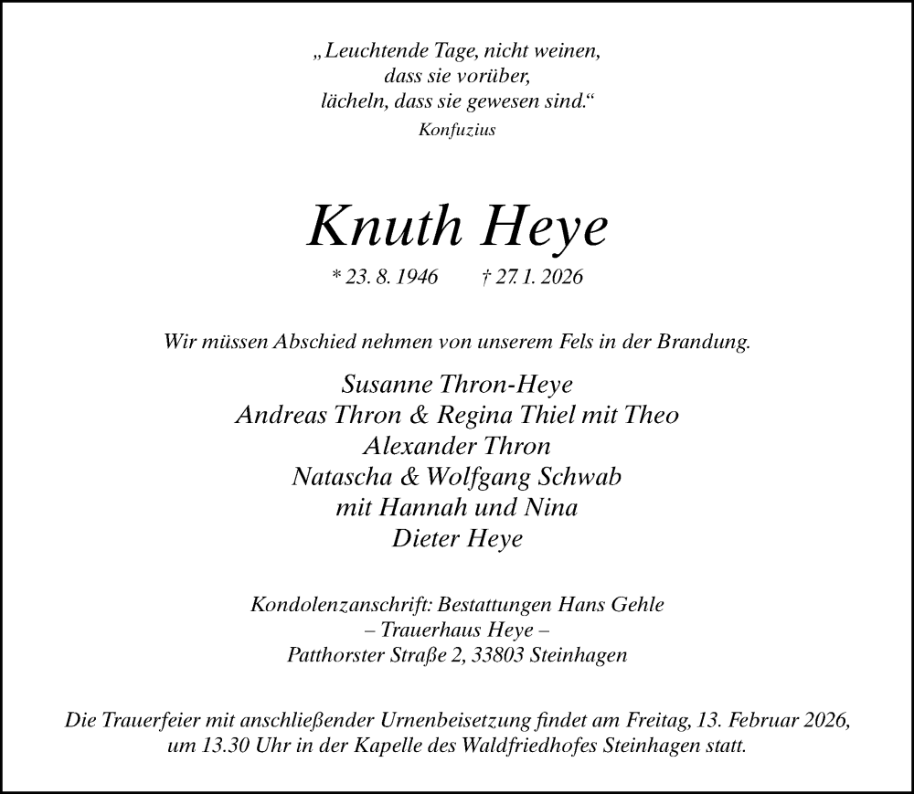 Hier finden Sie alle Traueranzeigen aus der Zeitung, die bisher für Knuth Heye erschienen sind. Weitere Traueranzeigen, die in der Zeitung erscheinen, werden hier ebenfalls aufgelistet