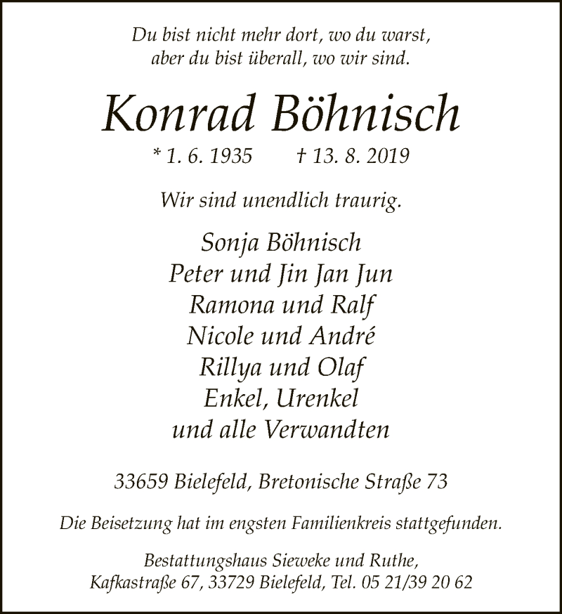 Hier finden Sie alle Traueranzeigen aus der Zeitung, die bisher für Konrad Böhnisch erschienen sind. Weitere Traueranzeigen, die in der Zeitung erscheinen, werden hier ebenfalls aufgelistet