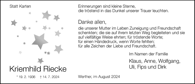Hier finden Sie alle Traueranzeigen aus der Zeitung, die bisher für Kriemhild Riecke erschienen sind. Weitere Traueranzeigen, die in der Zeitung erscheinen, werden hier ebenfalls aufgelistet