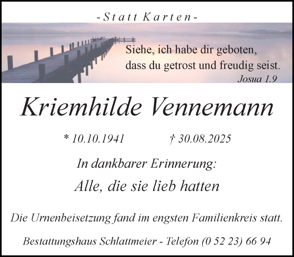 Hier finden Sie alle Traueranzeigen aus der Zeitung, die bisher für Kriemhilde Vennemann erschienen sind. Weitere Traueranzeigen, die in der Zeitung erscheinen, werden hier ebenfalls aufgelistet