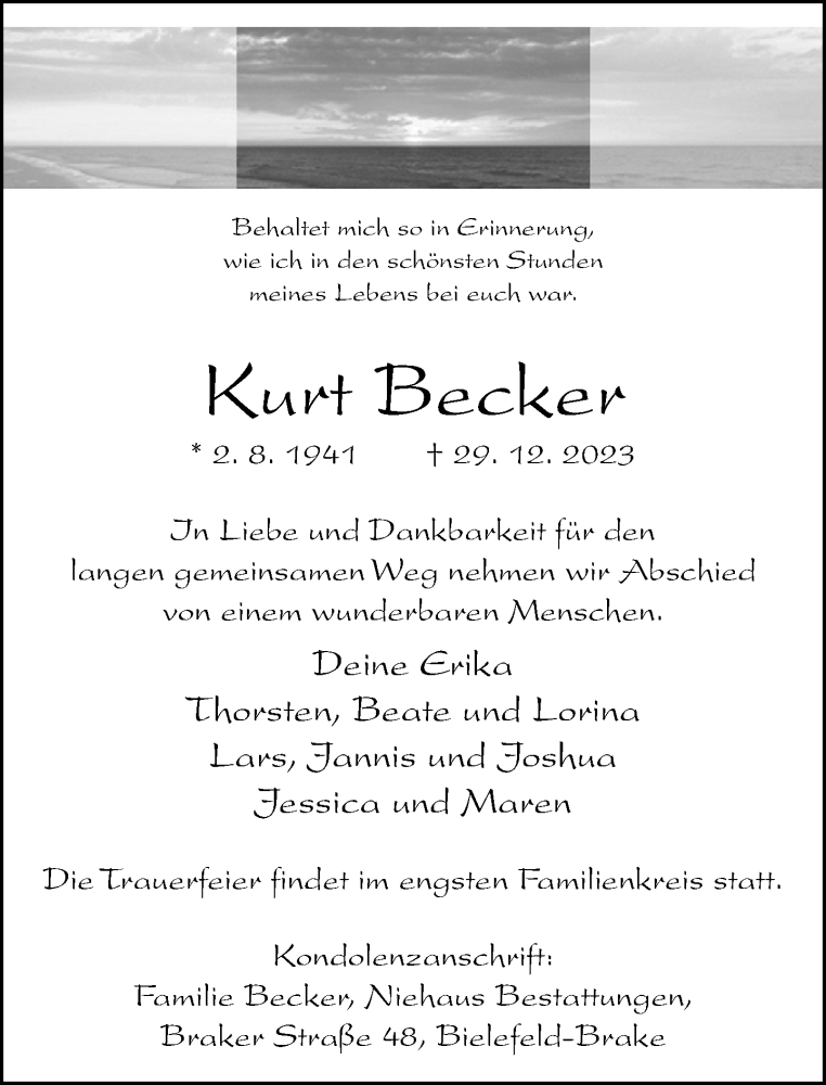 Hier finden Sie alle Traueranzeigen aus der Zeitung, die bisher für Kurt Becker erschienen sind. Weitere Traueranzeigen, die in der Zeitung erscheinen, werden hier ebenfalls aufgelistet