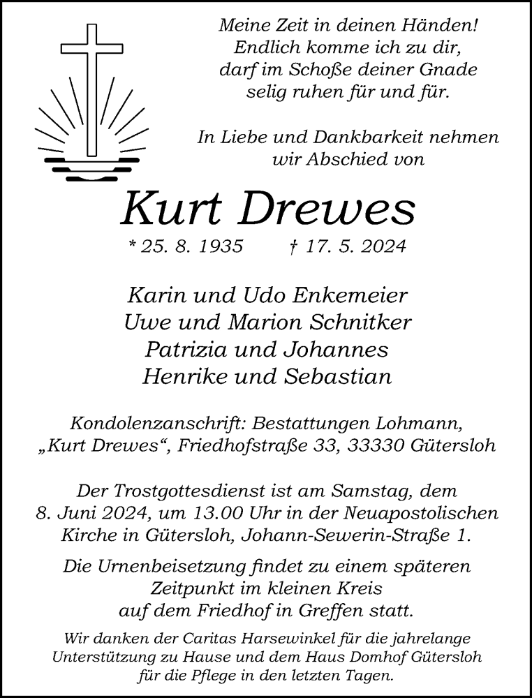Hier finden Sie alle Traueranzeigen aus der Zeitung, die bisher für Kurt Drewes erschienen sind. Weitere Traueranzeigen, die in der Zeitung erscheinen, werden hier ebenfalls aufgelistet