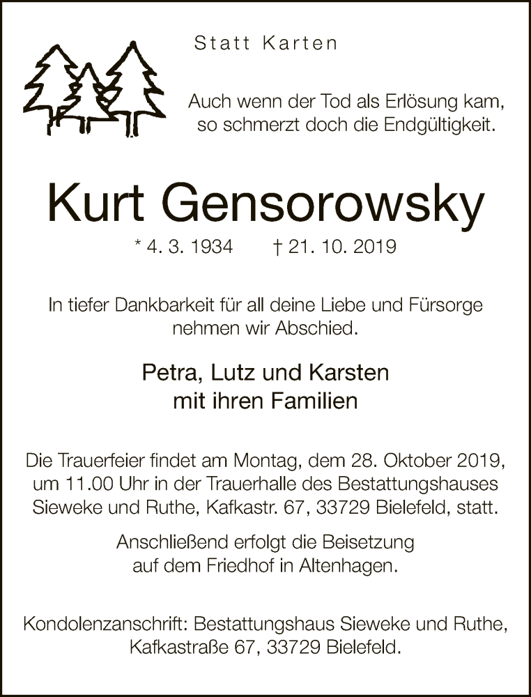Hier finden Sie alle Traueranzeigen aus der Zeitung, die bisher für Kurt Gensorowsky erschienen sind. Weitere Traueranzeigen, die in der Zeitung erscheinen, werden hier ebenfalls aufgelistet