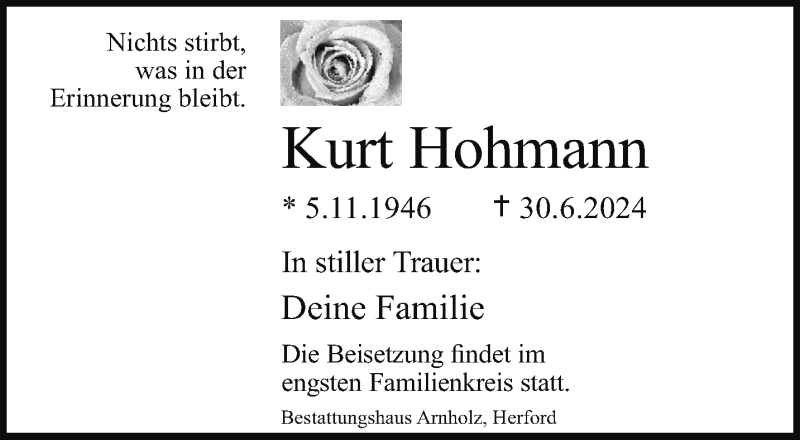 Hier finden Sie alle Traueranzeigen aus der Zeitung, die bisher für Kurt Hohmann erschienen sind. Weitere Traueranzeigen, die in der Zeitung erscheinen, werden hier ebenfalls aufgelistet