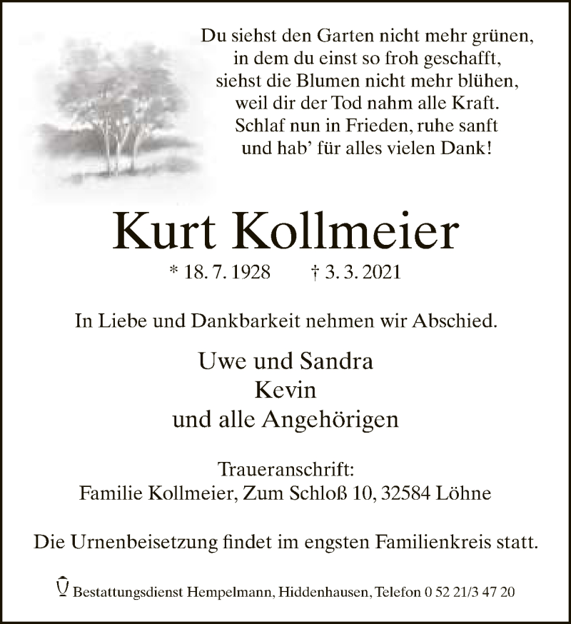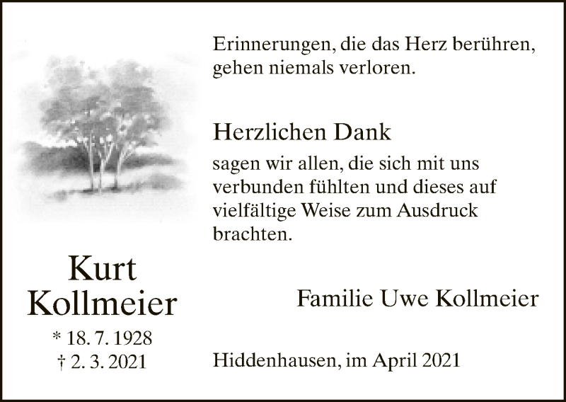 Hier finden Sie alle Traueranzeigen aus der Zeitung, die bisher für Kurt Kollmeier erschienen sind. Weitere Traueranzeigen, die in der Zeitung erscheinen, werden hier ebenfalls aufgelistet
