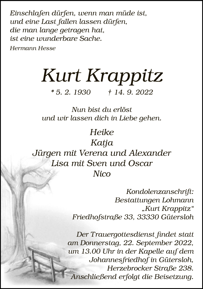 Hier finden Sie alle Traueranzeigen aus der Zeitung, die bisher für Kurt Krappitz erschienen sind. Weitere Traueranzeigen, die in der Zeitung erscheinen, werden hier ebenfalls aufgelistet