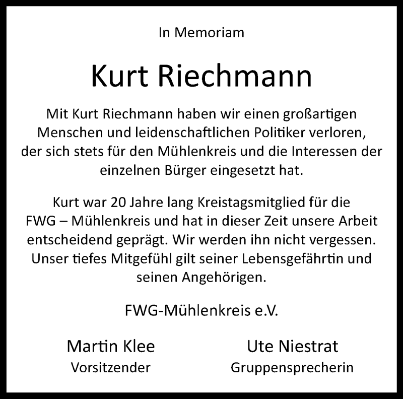 Hier finden Sie alle Traueranzeigen aus der Zeitung, die bisher für Kurt Riechmann erschienen sind. Weitere Traueranzeigen, die in der Zeitung erscheinen, werden hier ebenfalls aufgelistet
