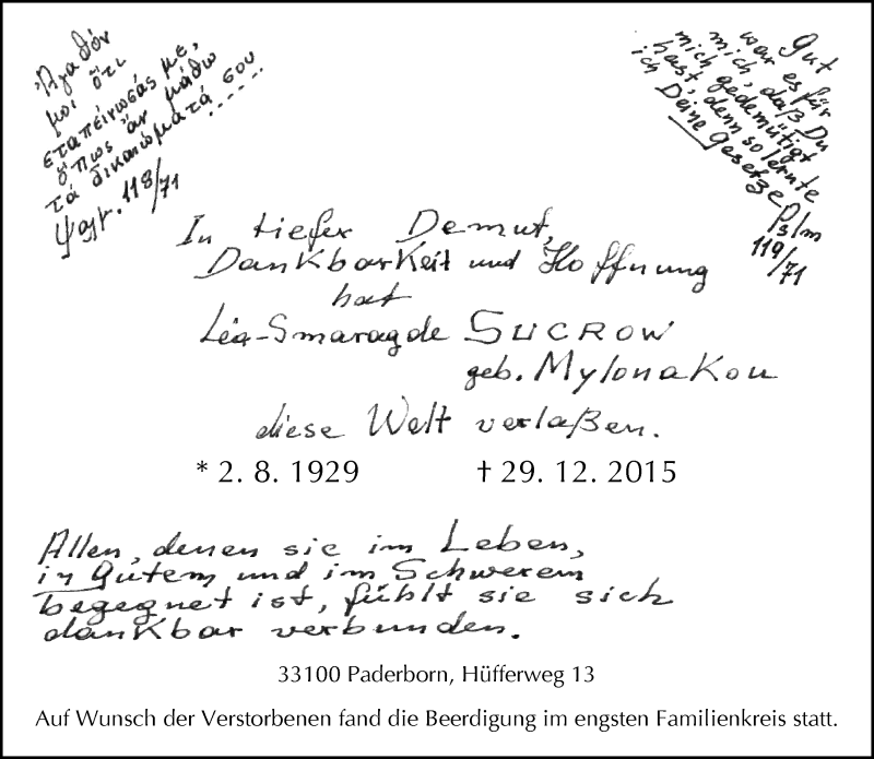 Hier finden Sie alle Traueranzeigen aus der Zeitung, die bisher für Lea-Smaragda Sucrow erschienen sind. Weitere Traueranzeigen, die in der Zeitung erscheinen, werden hier ebenfalls aufgelistet