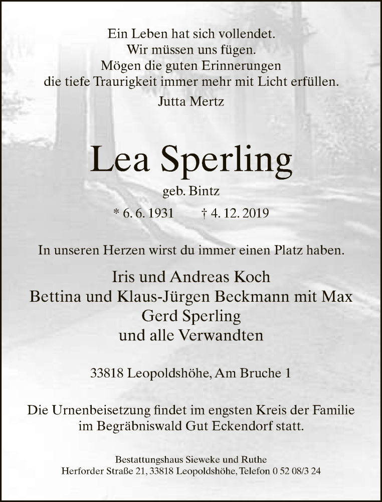 Hier finden Sie alle Traueranzeigen aus der Zeitung, die bisher für Lea Sperling erschienen sind. Weitere Traueranzeigen, die in der Zeitung erscheinen, werden hier ebenfalls aufgelistet